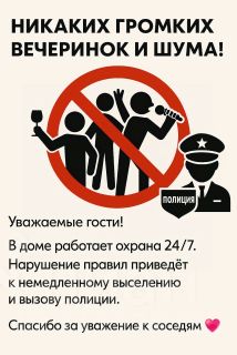 ПРИ НАРУШЕНИИ ПРАВИЛ ПРОЖИВАНИЯ И ТИШИНЫ БУДЕТ СРАЗУ ВЫЗВАНА ПОЛИЦИЯ С ВЫСЕЛЕНИЕМ ВСЕХ ГОСТЕЙ!!!