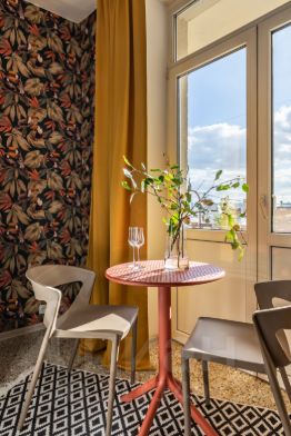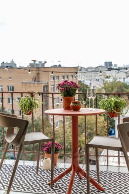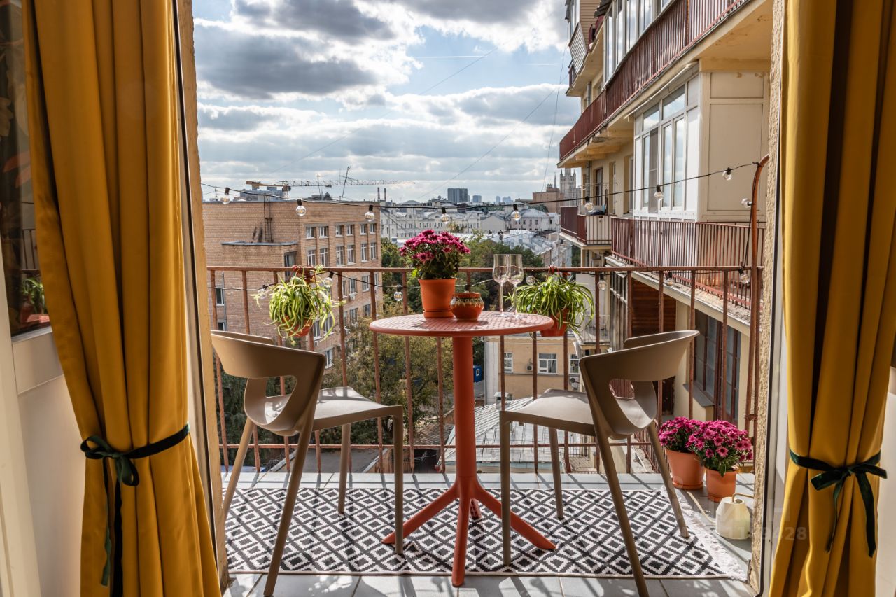 Окна квартиры выходят на Тверскую улицу, а с балкона видно не только двор, но и Сталинские высотки. На удобном подоконнике есть подушки, можно валяться, смотреть на Тверскую и мечтать На живописном балконе есть гирлянда и уличная мебель - завтракайте и пейте утренний кофе