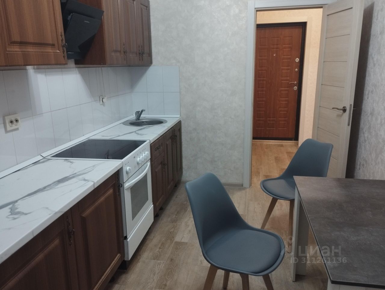 Кухня гарнитурная, добротный стол, стулья, холодильник, духовой шкаф, вытяжка, стиральная машина в ванной.