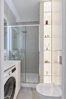 • Санузел: новая душевая кабина, бойлер для горячей воды, вместительные зоны хранения, стиральная машина.