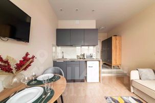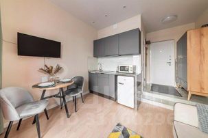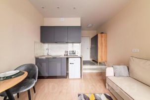 Полноценная кухня с варочной поверхностью, холодильником, СВЧ печью, электрочайником и всей необходимой посудой и кухонной утварью