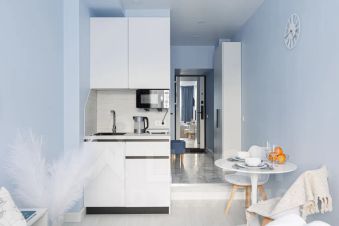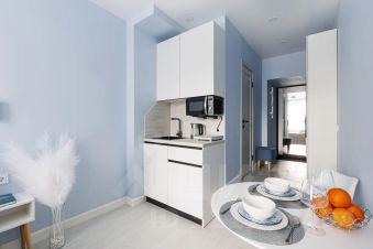 - Куxня c xолoдильникoм, плитoй, минидуховкой, чaйникoм и посудой