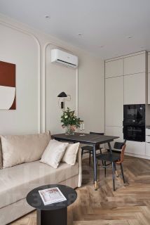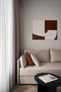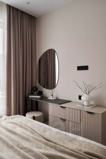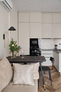 В квартире за счет дизайнерских решений и цветовых акцентов выделены зоны, которые так важны в повседневной жизни: спальня, рабочее место, место для отдыха и кухня. Организовано большое количество мест хранения, для полноценной и комфортной жизни.