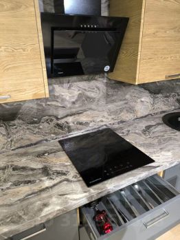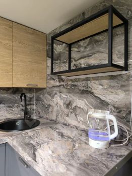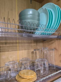 Полноценная кухня укомплектована варочной панелью, холодильником, посудомоечной и стиральной машинами, посудой, необходимой для готовки.