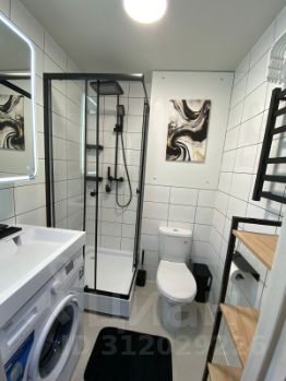 Ванная комната с душевой кабиной, стиральной машинкой и всеми необходимыми аксессуарами.