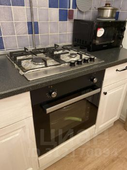На кухне: Газовая плита, холодильник, электрический чайник, микроволновка, духовка, посуда.
