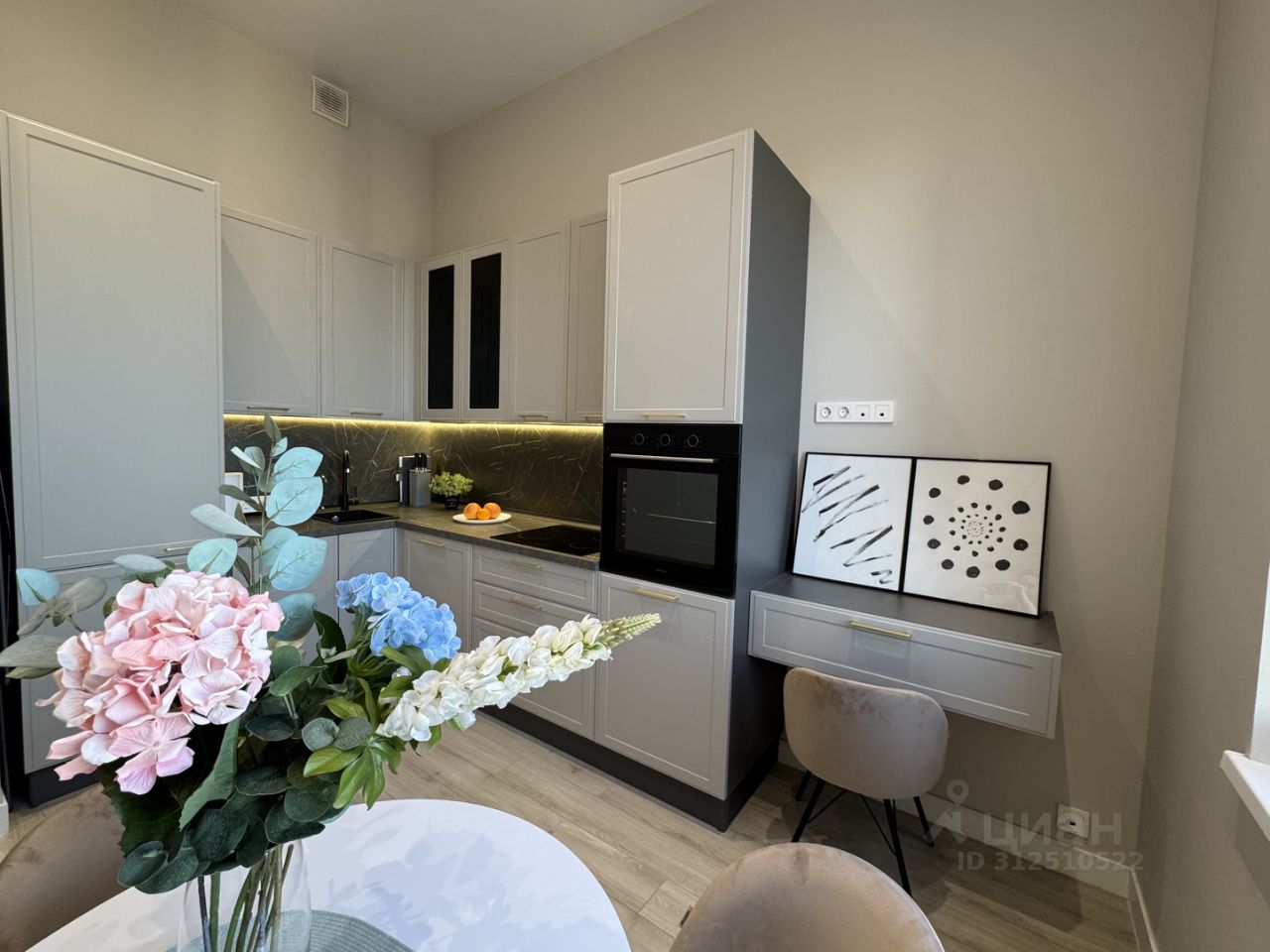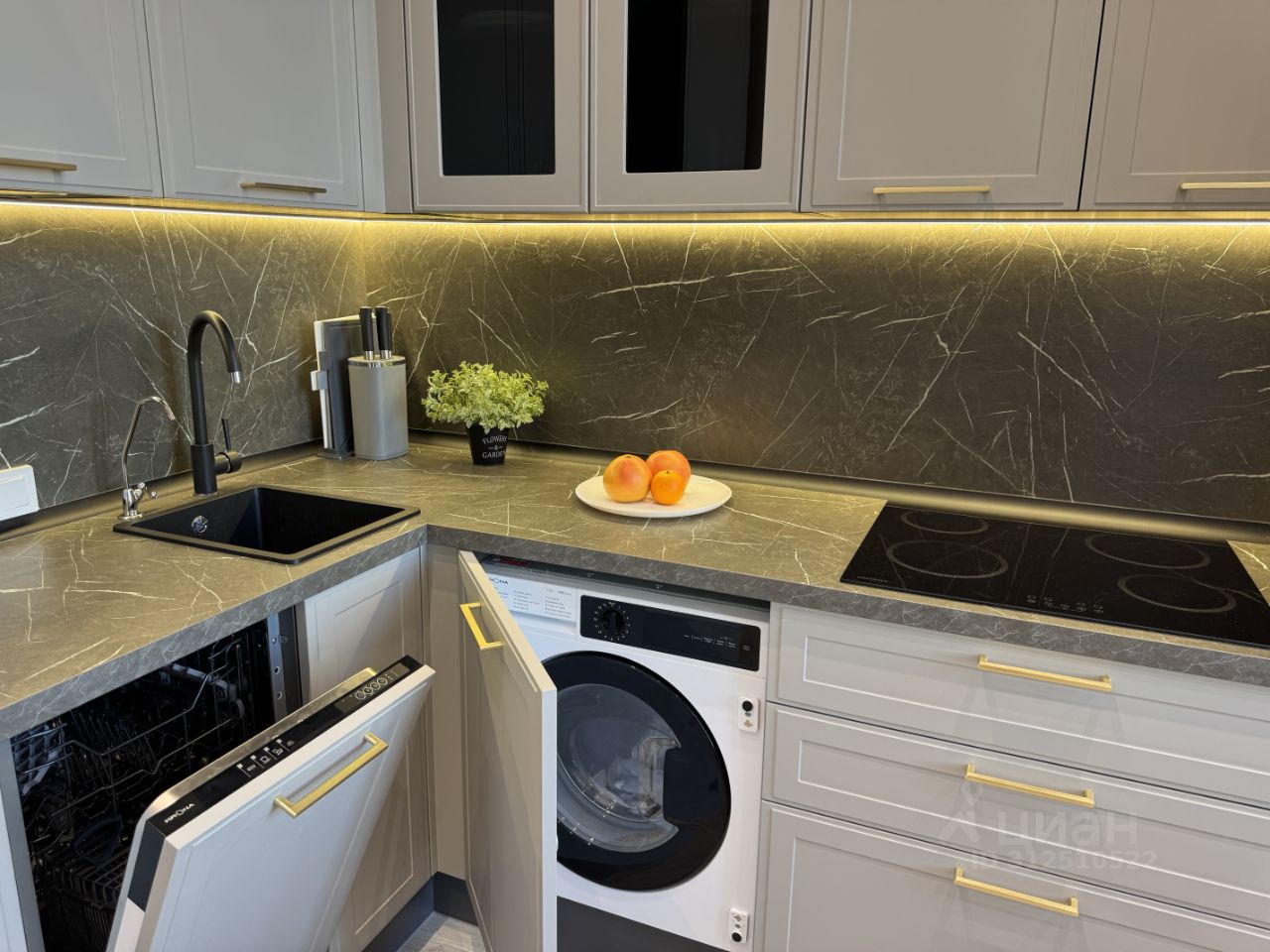 встроенный гарнитур с техникой: плита, духовой шкаф,посудомоечная и стиральная машина, стол со стульями;