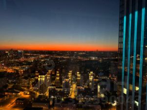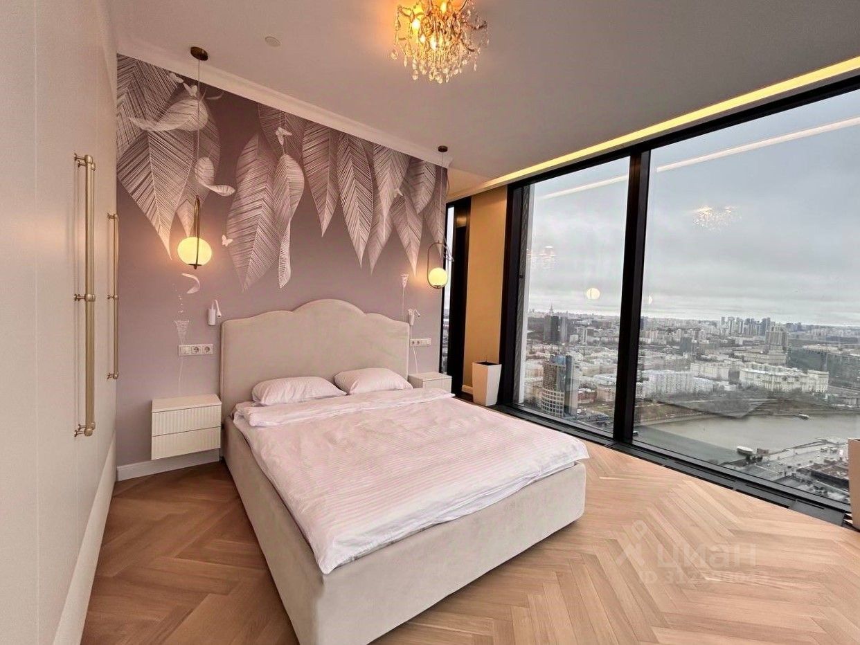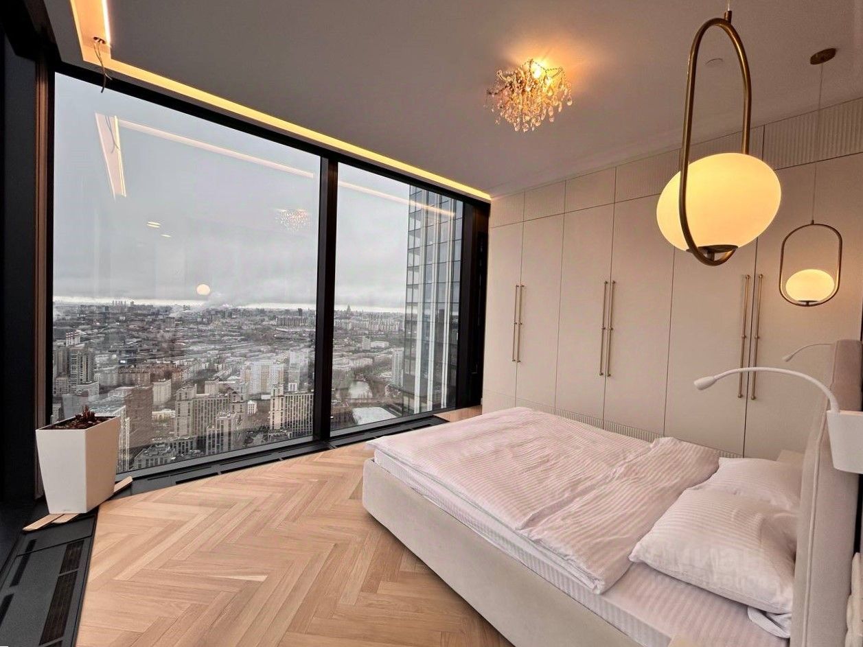 В родительской спальне угловое остекление и шикарные виды на Москва Сити и город.