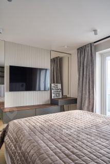 Мастер спальня с гардеробной, вторая спальня с кроватью и шкафом для хранения вещей, эргономичная кухня гостиная с мягкой зоной и детская (опционально можно оформить под кабинет) + огромная лоджия вдоль всей квартиры.
