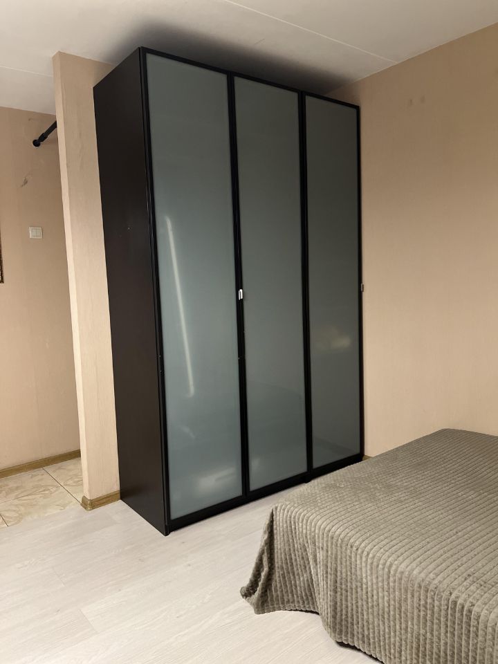 диван раскладной, кровать, большой шкаф, телевизор, стиральная машина, плита, пылесос.