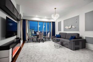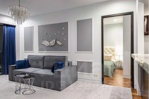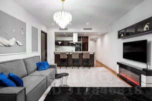 Апартаменты состоят из гостиной, совмещенной с кухней с барной стойкой , отдельной спальни , холла, гостевого туалета , основного санузла.