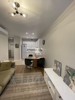 В квартире сделан евроремонт, поэтому можно наслаждаться стильной и комфортной обстановкой. В комнатах и на кухне есть вся необходимая мебель. Здесь вы найдете холодильник, стиральную машину, кондиционер, телевизор и посудомоечную машину, поэтому можно мгновенно обустроиться и почувствовать себя как дома. Санузел совмещенный, в ванной установлена ванна. Окна выходят во двор, поэтому вас не потревожит шум улицы.