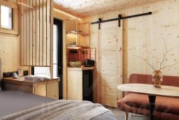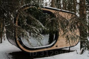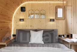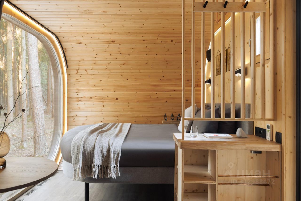 В небольшом модуле располагается двуспальная кровать, мини-кухня с обеденной зоной, санузел и веранда с зоной отдыха. Терраса модуля оборудована современным гриль-мангалом и мебелью для отдыха. В шаговой доступности живописное озеро, окруженное лесом.
