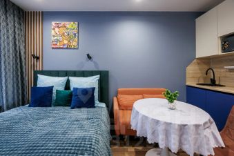 В апартаментах вы найдете все необходимое для комфортного пребывания: двуспальную кровать с всегда свежим бельем, скоростной Wi-Fi, кухню с полным набором посуды, свежие полотенца и тапочки, кондиционер и гладильные принадлежности. Стирка и сушка белья доступны в общей зоне, за дополнительную плату.