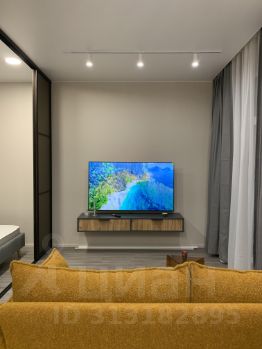 В гостиной яркий диван, телевизор Haier, 75 дюймов, wi-fi, тумба под телевизором, кондиционер.