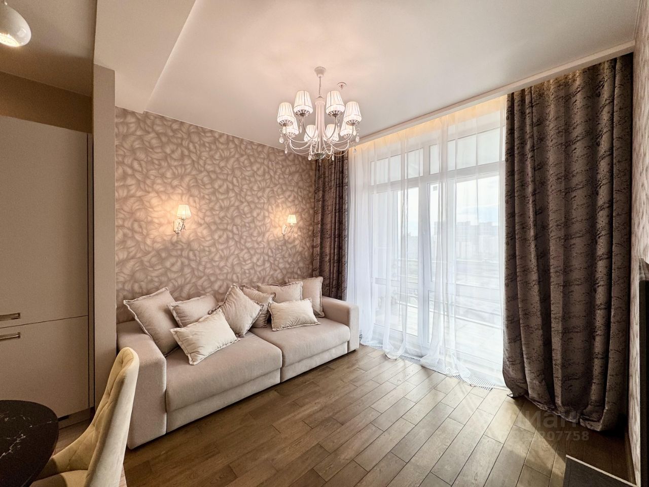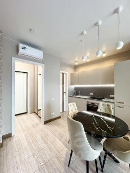 В квартире выполнен дизайнерский ремонт, пол в гостиной и в спальне выложен доской из натурального дуба, в кухне, с/у мраморная плитка с подогревом. Удобная и качественная мебель, диван раскладывается, что создаёт дополнительное спальное место. Качественный кухонный гарнитур со всей необходимой техникой. Из техники предусмотрены холодильник, посудомоечная машина, духовка, стиральная машина - все марки Bosh, а так же телевизор и кондиционер. Санузел совмещенный и оборудован ванной.