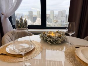 • Кофемашина, чайник, встроенные духовой шкаф и СВЧ, индукционная варочная панель, посудомоечная машина, стиральная машина с сушкой, фильтр питьевой воды. А также полный комплект посуды для приготовления еды.