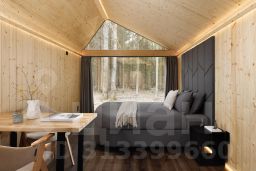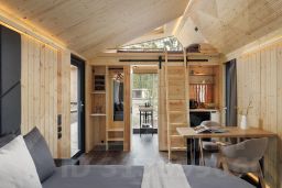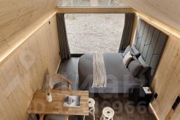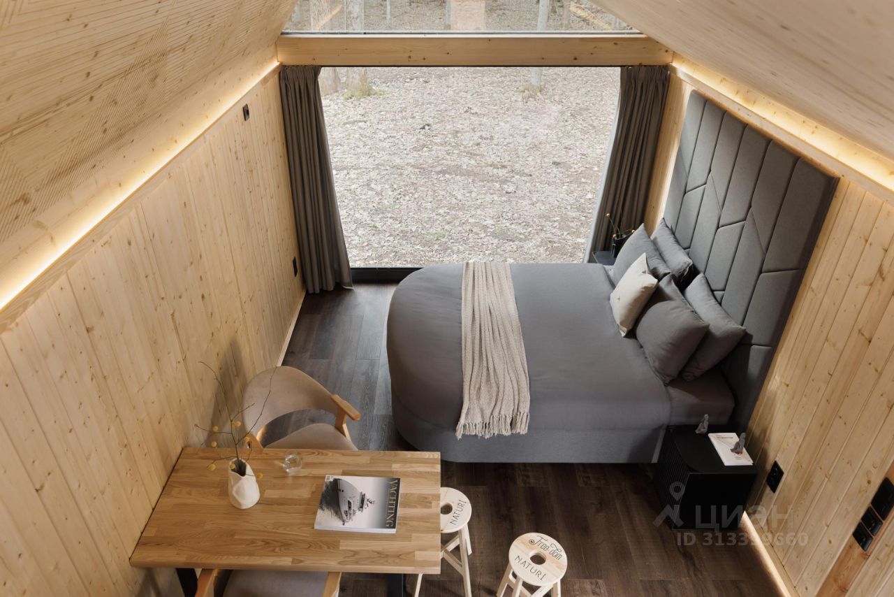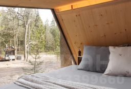 Двухуровневый домик: на первом уровне расположена двуспальная кровать, мини-кухня с обеденной зоной и санузел с панорамным окном и тропическим душем. На антресоли двуспальное место под панорамным окном в крыше для созерцания ночного неба. У дома своя терраса, оборудованная гриль-мангалом и всем необходимым для пикника на природе. В шаговой доступности живописное озеро, окруженное хвойным лесом.