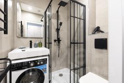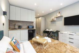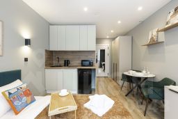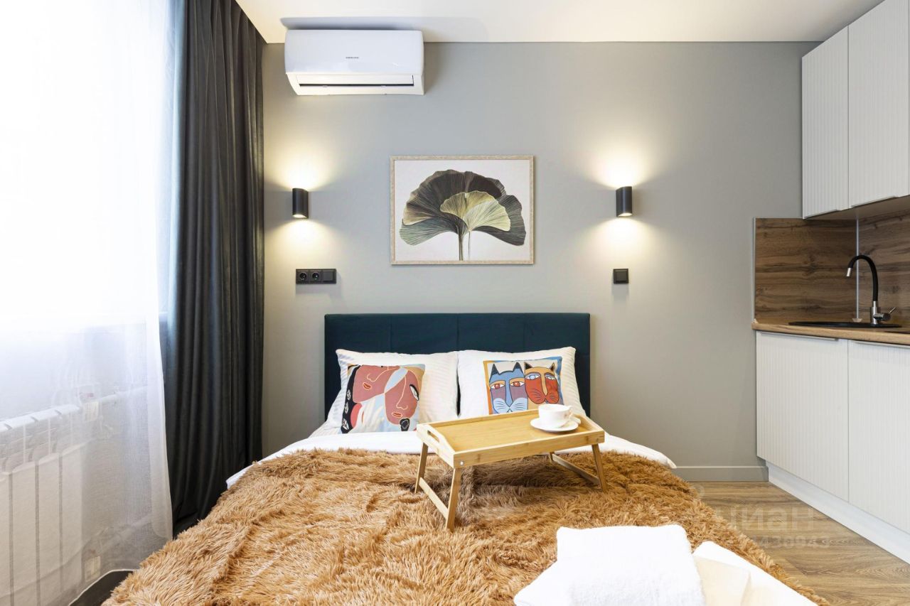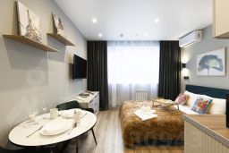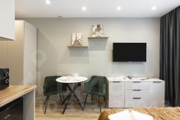 В студии есть: кондиционер, стиральная машина, телевизор, кухня с холодильником, плитой, микроволновкой, чайником и посудой, фен, утюг, сушилка для белья и гладильная доска.