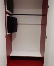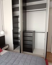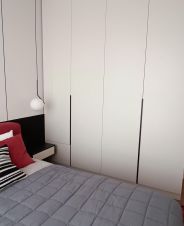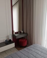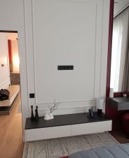 В изолированной комнате двухспальная кровать, прикроватные тумбы с подсветками, два вместительных шкафа, тумба под TV, зеркало.