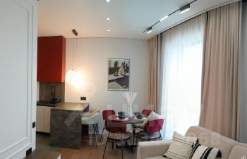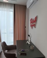 Уютная квартира с дизайнерским ремонтом. Кухня столовая и гостиная - студия, с двумя большими окнами в пол, изолированная спальня. Кухня встроенная с подсветкой со всей необходимой техникой: холодильник, посудомоечная машина, духовой шкаф, электроплита, вытяжка, микроволновка, обеденная группа с барной стойкой. Рабочая зона. В зоне отдыха расположен диван (раскладывается) для комфортного отдыха.