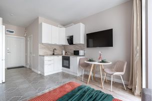 Оптимальное оснащение всей необходимой техникой: варочная панель, духовой шкаф, эл. чайник, микроволновая печь, холодильник, пылесос, фильтр для воды, стиральная машина, сушилка для белья, фен, гладильная доска и утюг, Smаrt ТV с НD телевидением. Высокоскоростной WiFi.
