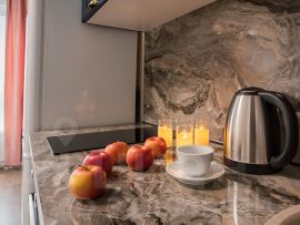 Наши гости могут готовить на полностью оборудованной кухне с бытовой техникой и посудой. Есть плита, микроволновая печь, духовка, посудомоечная машина, электрический чайник и холодильник.
