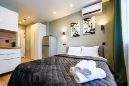 В студии есть: кондиционер, стиральная машина, телевизор, кухня с холодильником, плитой, микроволновкой, чайником и посудой, фен, утюг, сушилка для белья и гладильная доска.