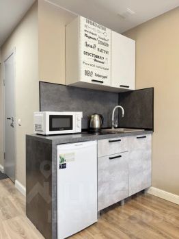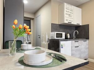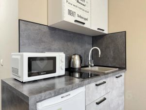 - Кухня со всей необходимой техникой: холодильник, микроволновая печь, плита, чайник.