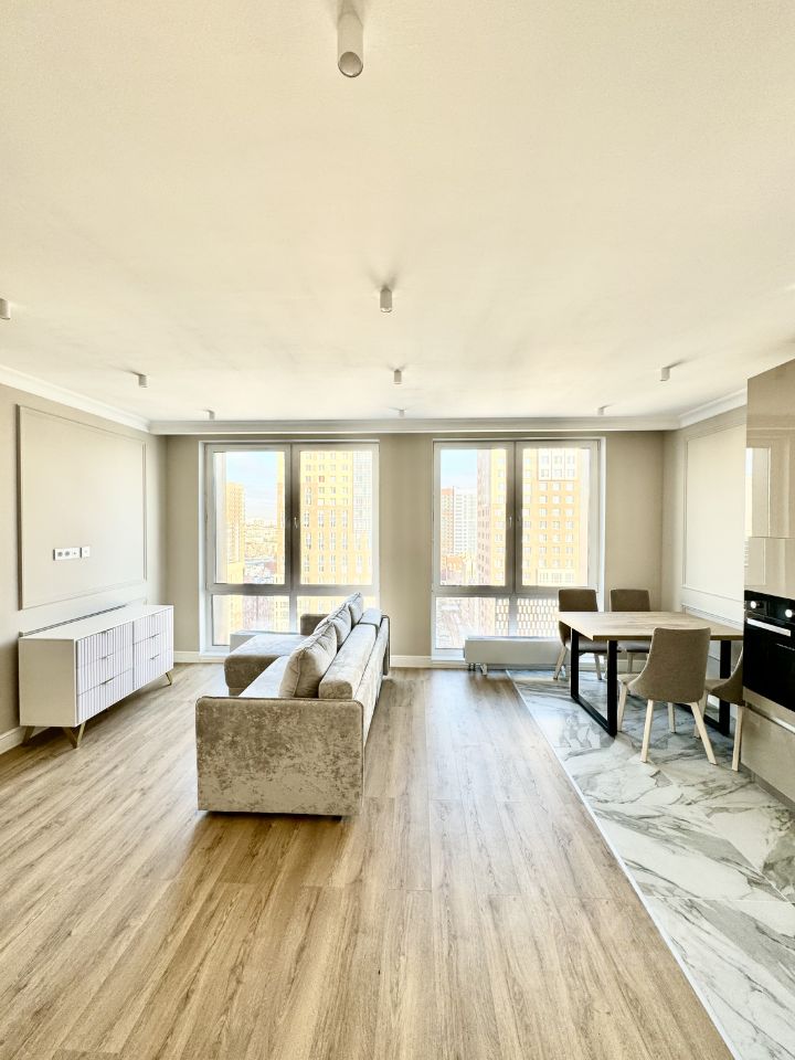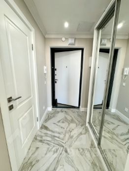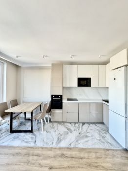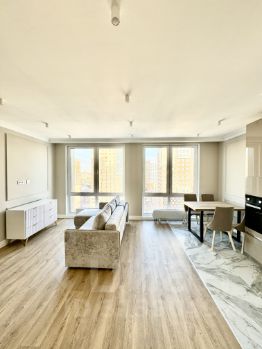 Новая, светлая, 2 панорамных окна по всей стене и прекрасный вид. Квартира оборудована для проживания. Всё новое, кухонная мебель, укомплектована техникой (холодильник, плита, посудомоечная машина), столовая-гостиная и место для спальни, полностью меблирована. Санузел совмещенный, оснащён полноценной ванной.