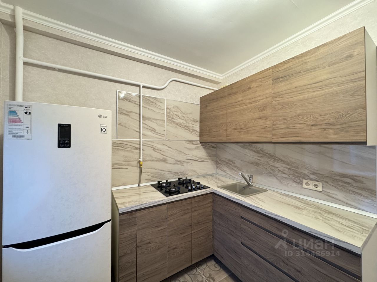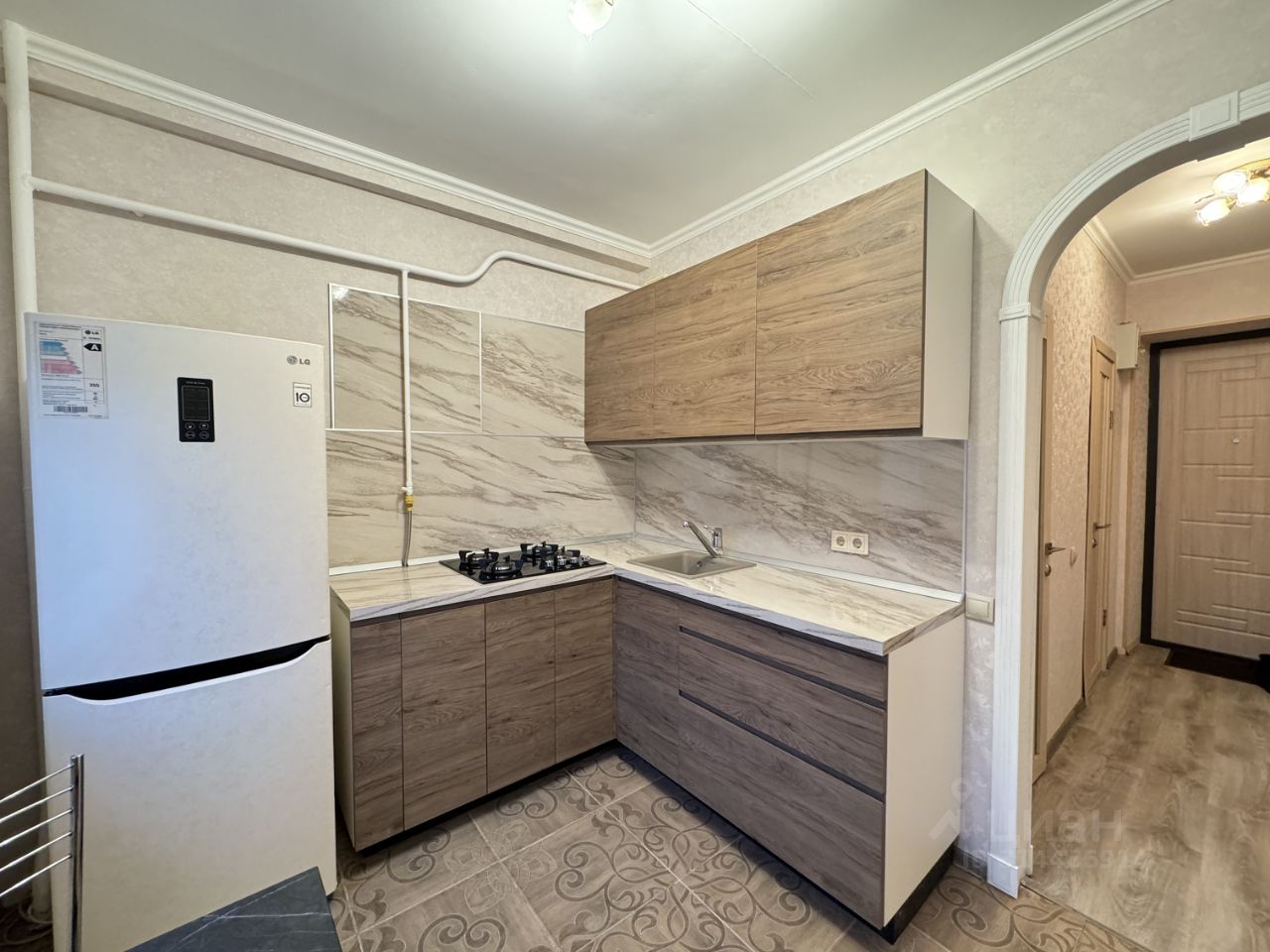 Кухня оборудована: газовой плитой, холодильник и шкафы для хранения.