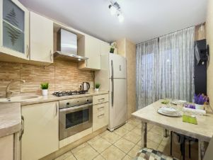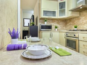 Оборудованная кухня, полный комплект посуды для приготовления и приёма еды,