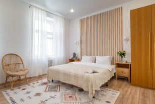 В квартире 2 просторные комнаты: гостиная комната с двухспальной кроватью (160*200) и диваном (раскладывается в спальное место 160*200). В изолированной спальной комнате особо широкая двухспальная кровать (180*200).
