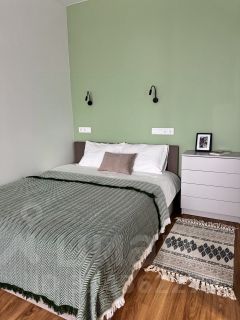 Квартира оснащена всем необходимым для жизни: комната с двуспальной кроватью с подъемным механизмом, раскладным диваном, большим шкафом, просторная кухня с кухонным гарнитуром с посудомоечной машиной, холодильником и СВЧ, стиральная машина в ванной комнате.