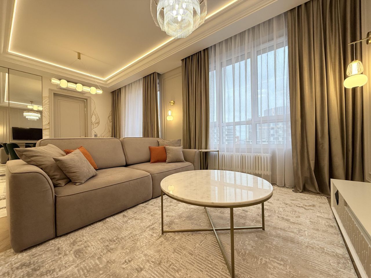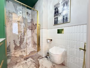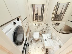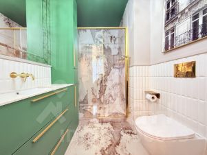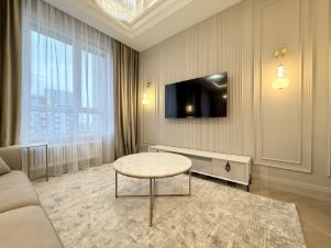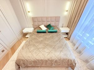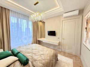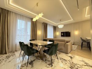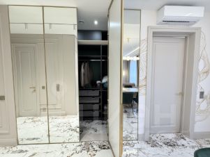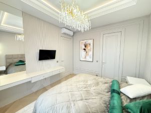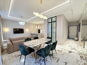Квартира с дизайнерским ремонтом и полностью готова к комфортному проживанию. В комнатах и на кухне есть вся необходимая мебель, а также современная техника: кондиционер, холодильник, посудомоечная и стиральная машины, телевизор. Два совмещенных санузла оборудованы душевой кабиной. Окна выходят на улицу, обеспечивая прекрасный вид и достаточное количество света.