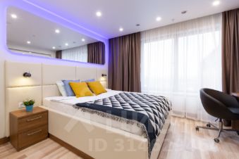 В апартаментах кровать queen-size с синей подсветкой, рабочая зона со столом и удобным креслом и кухня с барной стойкой. Вид на парк с 19 этажа.