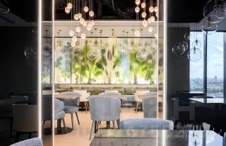Внутри здания находится торговая галерея с магазинами и ресторанами с кухней разных стран, Вкусно-и-точка, Правда-кофе, бар, фитнес-клуб с залом для йоги, салон красоты, коворкинг и лаунж-зона, смотровая площадка-веранда с зоной для курения.