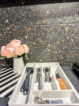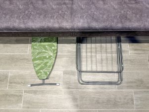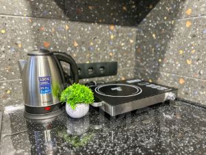 Двуспальный диван, сушилка для белья, фен, оборудованная кухня, холодильник, полный комплект посуды для приготовления и приёма еды, стиральная машина .