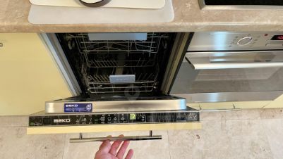 Оборудованный кухонный гарнитур, дорогая встроенная бытовая техника, 2-х камерный холодильник, посудомоечная машина.