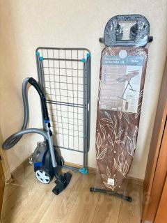 В комнате: Новый двухспальный диван-книжка, ,2 тумбочки, стеллаж, шкаф, полки, комод, вешалка для сушки одежды, пылесос, утюг.