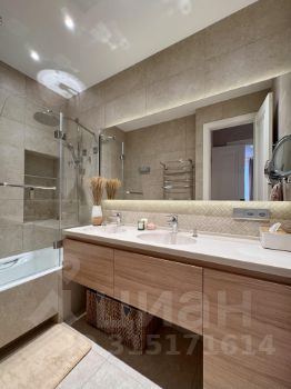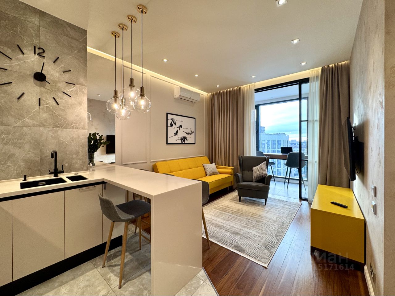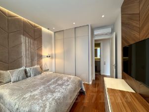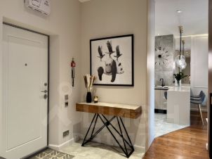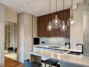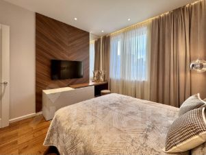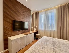 Квартира полностью укомплектована современной мебелью и бытовой техникой, включая встроенные холодильник, стирально-сушильную и посудомоечную машины, а также два телевизора.