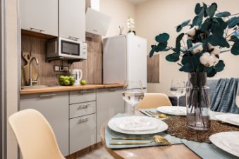На уютной кухне Вы с удовольствием позавтракаете в тишине. Кухня полностью оборудована всей необходимой посудой и техникой, сможете приготовить себе домашний ужин.