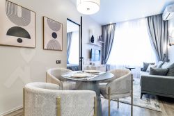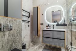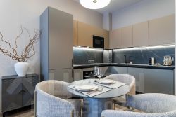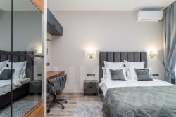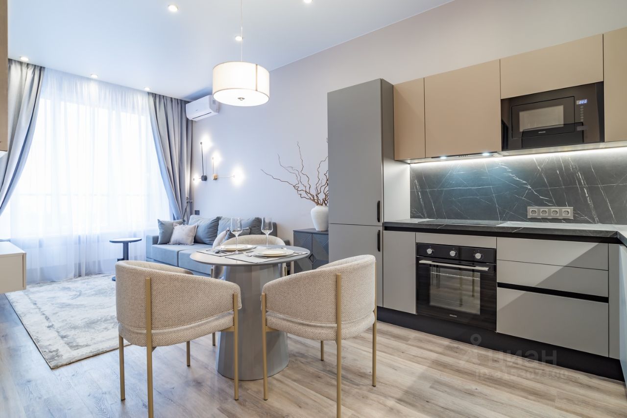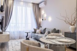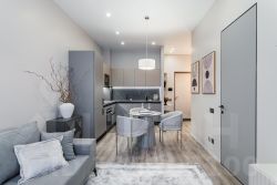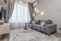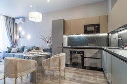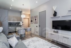Кухня гостиная полностью укомплектована качественной бытовой техникой (посудомоечная машина, духовой шкаф, холодильник, варочная панель, микроволновая печь), зона гостиной укомплектована комфортным диваном и телевизором. Два кондционера, теплые полы,