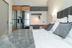 в спальне установлена кровать 160*200 с высоким ортопедическим матрасом от компании Moon и большим местом хранения, а также вместительный шкаф и небольшая рабочая зона.