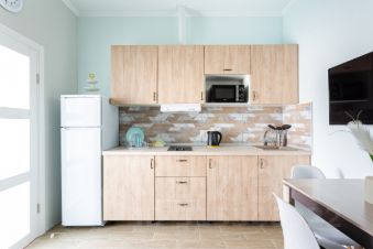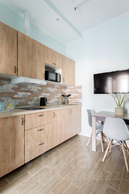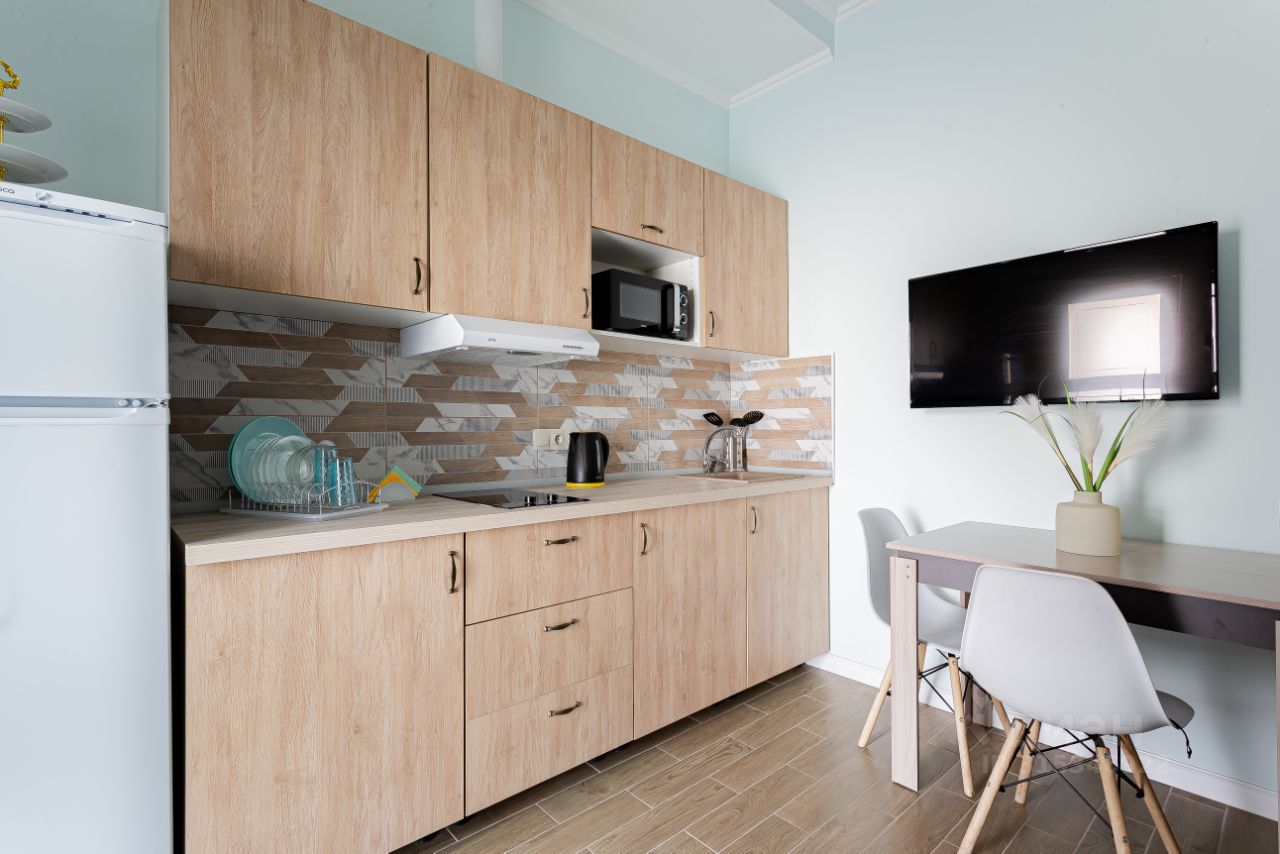 Студия полностью оборудована для комфортного проживания: телевизор, бесплатный Wi-Fi, стиральная машина, утюг, фен, варочная панель, чайник и микроволновка. Есть штопор и бокалы. Регулярная уборка профессиональной химией и дезинфекция от насекомых, а также смена белья на чистое и свежее проводятся перед каждым заездом.