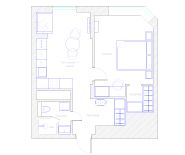 Гостиная-кухня имеет удобный кухонный гарнитур с большим объемом хранения, встроенным холодильником, посудомоечной машиной, индукционной плитой, вытяжным зонтом, встроенным духовым шкафом и микроволновой печью. Есть комфортная подсветка рабочих зоны. Так же, для удобства есть встроенная система фильтрации воды. Главным достоинством гостиной является панорамное окно рядом с которым расположен уютный диван, сидя на котором, можно наслаждаться видом из окна с 18 этажа или посмотреть телевизор со всеми необходимыми в современной жизни функциями. Для полного комфорта, в зоне панорамного окна пол оснащен подогревом. Диван в гостиной раздвижной.