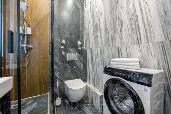 Санузел с ванной и душем, стиральная машина, фен, зеркало с подсветкой, утюг.
