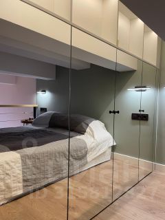 Двуспальная кровать и множество встроенных зеркальных шкафов.