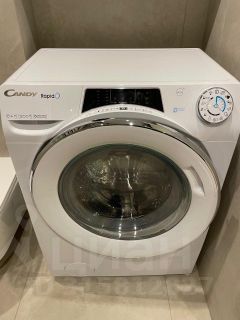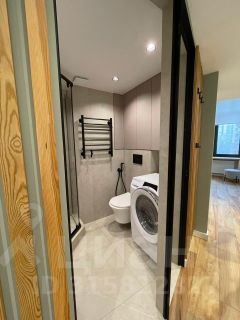Санузел: душевая кабина, стиральная машина, множество мест для хранения.