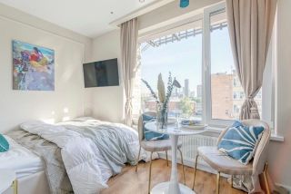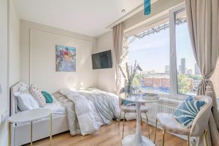 Большие окна. Качественная дорогая мебель и техника. Интерьер продуман до мелочей. Апартаменты, откуда не хочется уезжать.